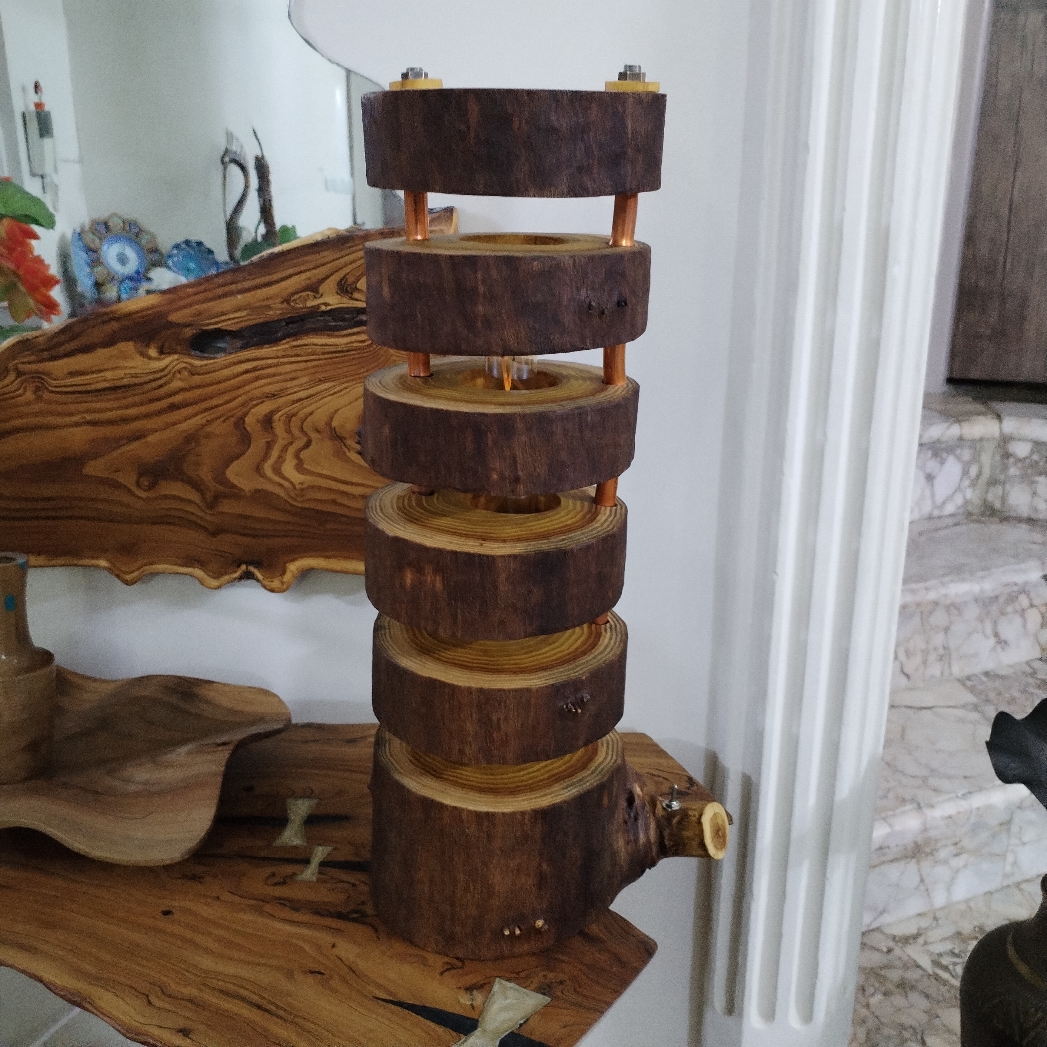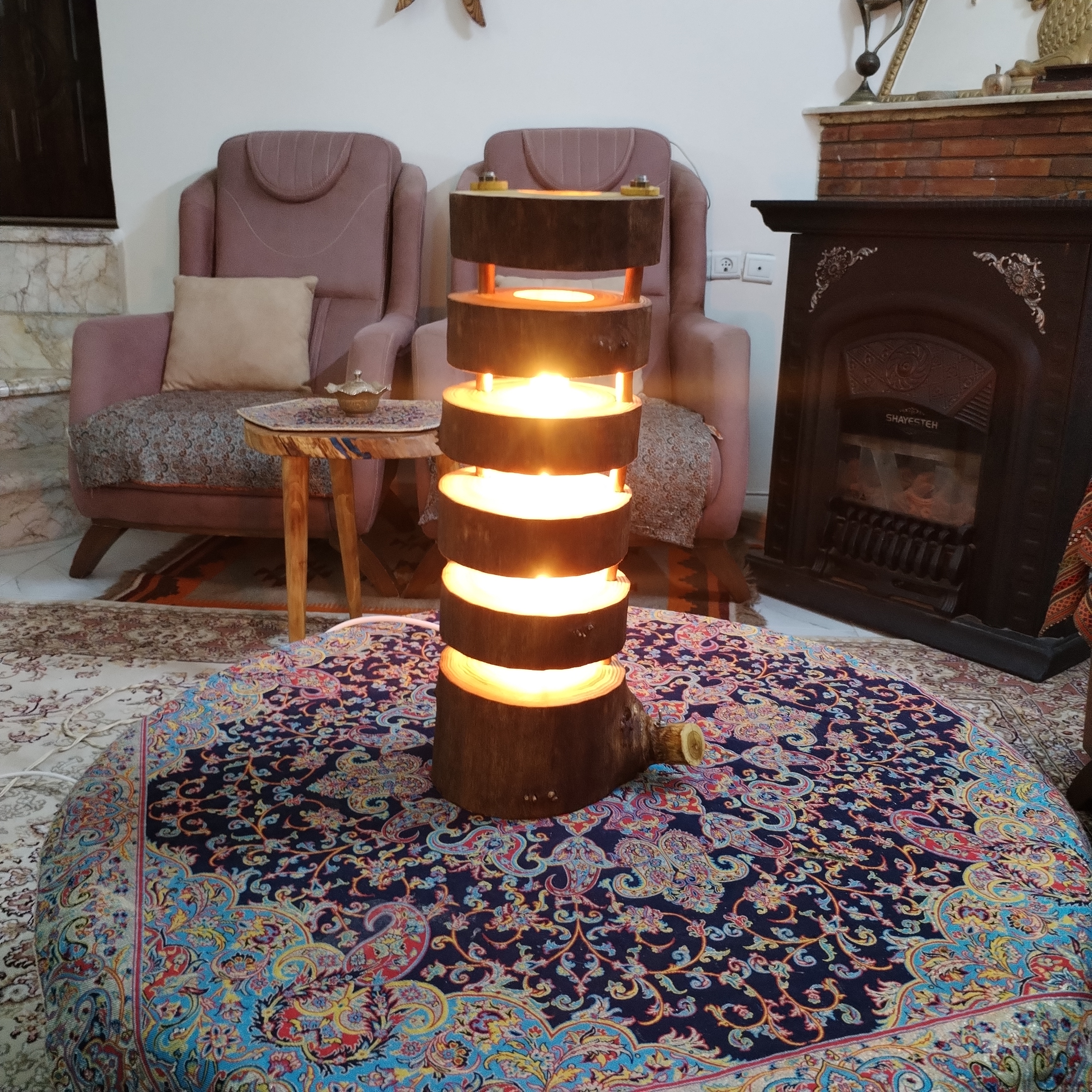 آباژور کنار سالنی طبقاتی سایز متوسط محصولی بسیار زیبا و جذاب که بصورت یونیک و تک نسخه توسط استاد کاران ماهردر مجموعه گالری چوب لوکس تولید شده